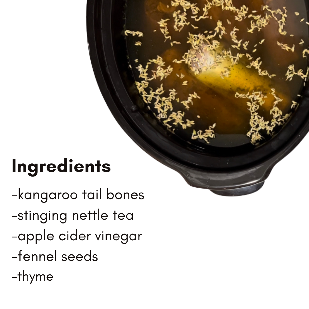 kangaroo, stinging nettle tea, apple cider vinegar, fennel seeds, thyme, water.