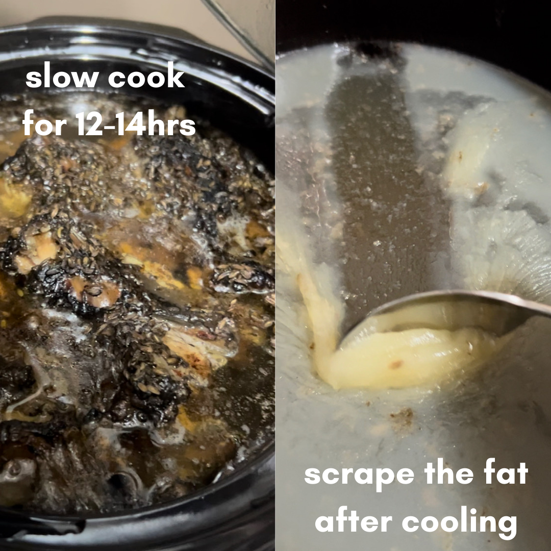 We slow cook the bones for 12-14hrs with all of the above, then remove the meat and bones and allow the broth to set in the fridge before removing the layer of fat and packaging.